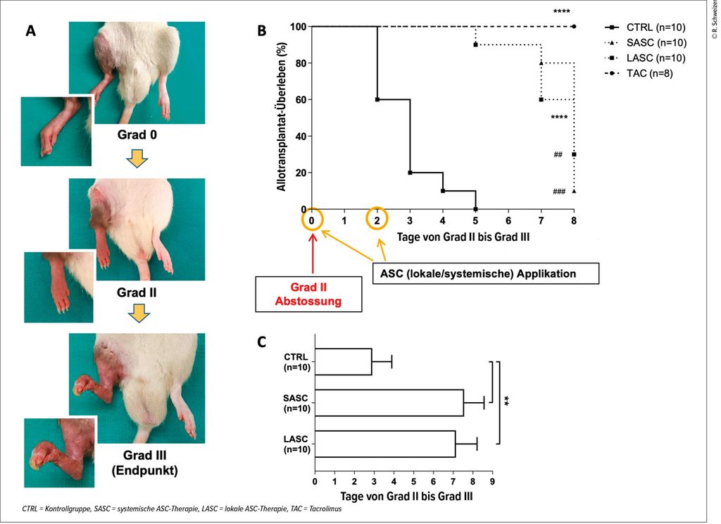 Während diese Zellen aus Fett oder Knochenmark von unserer und weiteren Gruppen bereits zur Prävention der Abstossung bei VCA und Toleranzentwicklung erfolgreich im Tiermodell getestet wurden (Abb.2),7–11 ging es in der aktuellen Studie um eine andere Frage: Können diese Stammzellen eine Abstossung behandeln, wenn sie bereits begonnen hat?