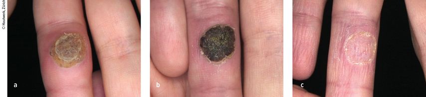 Abb. 1: Erfolgreiche Therapie mittels Kryotherapie. (a) Warzengewebe in seiner ursprünglichen Form. (b) Krusten bilden sich nach längerer Applikationsdauer und sind therapeutisch gewollt – diesbezüglich ist eine Patientenaufklärung sehr wichtig. (c) Nicht mehr detektierbares Warzengewebe nach der Behandlung