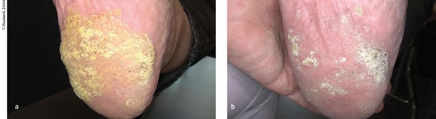 Mosaikwarzen sind eine Sonderform der Plantarwarzen (Verrucae plantares) und erscheinen als dicht aneinandergereihte, konfluierende Warzenplaques an den Fusssohlen. Typisch ist ein weisslich bis gelb gefärbtes Warzenbeet, das klinisch wie ein Mosaikfeld imponiert. Häufige Prädilektionsstellen sind plantar belastete Areale, insbesondere die Zehenunterseiten und der Vorfussballen.1,2 Nur in seltenen Fällen sind die Hände betroffen. Verrucae plantares gehören zu den auf verhorntem Plattenepithel wachsenden Warzen, die aufgrund des ständigen mechanischen Druckes eher in die Tiefe wachsen. Charakteristischerweise unterbrechen Warzen die normalen Hautlinien und weisen punktförmige Einblutungen auf, die u.a. auch typisch für Mosaikwarzen sind. Histopathologisch zeigt sich eine papillomatöse Epidermis mit Akanthose und ausgeprägter Hyperkeratose und virusassoziierten Koilozyten. Das Vorhandensein von Koilozyten und den teils thrombosierten Kapillaren («dotted vessels») hilft bei der differenzialdiagnostischen Abgrenzung zu beispielsweise Clavi oder Calli.3 Ursächlich handelt es sich um eine Infektion der Epithelzellen mit humanen Papillomaviren (HPV), überwiegend die HPV-Typen 1, 2, 4, 27 und 57 betreffend.1,4 Die Übertragung von Mensch zu Mensch erfolgt direkt oder über kontaminierte Oberflächen wie beispielsweise in gemeinschaftlichen Duschen oder in Schwimmbädern, begünstigt durch eine vorgeschädigte Hornschicht.