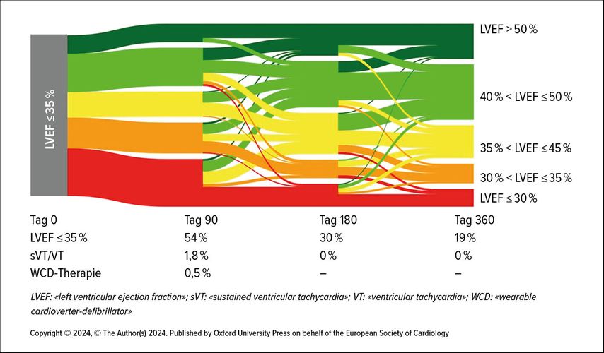 Die aktuellen ESC-Leitlinien empfehlen zur Primärprävention des plötzlichen Herztodes (SCD) den Einsatz eines implantierbaren Kardioverter-Defibrillators (ICD) bei Patienten mit koronarer Herzkrankheit, symptomatischer Herzinsuffizienz (NYHA II–III) und linksventrikulärer Ejektionsfraktion (LVEF) ≤35% trotz mindestens dreimonatiger optimaler medikamentöser Therapie (Klasse I, Evidenzgrad A).3 Die Evidenzbasis dieser Empfehlung stützt sich massgeblich auf die MADIT-II-Studie, in welcher die primärprophylaktische ICD-Implantation bei 742 Patienten mit ischämischer Kardiomyopathie, LVEF <30% und einem zurückliegenden Myokardinfarkt untersucht wurde. In der ICD-Gruppe zeigte sich über einen mittleren Zeitraum von 20 Monaten eine absolute Risikoreduktion der Gesamtmortalität um 5,8% (NNT: 17) und über einen Zeitraum von 8 Jahren eine durchschnittliche Lebensverlängerung von ungefähr sechs Monaten.4,5