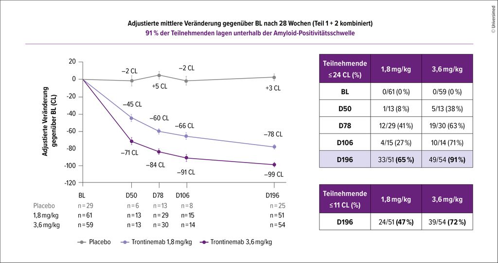 Abb. 2: Dosisabhängige biologische Wirkung des Amyloidantikörpers Trontinemab (dzt. Entwicklungsphase III) auf die Amyloidpathologie gemessen mit der Positronen-Emissions-Tomografie. Das rasche und effiziente Clearing der Amyloidablagerungen ist Voraussetzung für die klinische Wirkung (modifiziert nach Kulic L. et al.: Oral Presentation at AAIC, Toronto, July 2025)