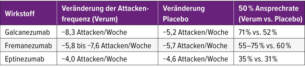 Tab. 2: Veränderung der Attackenfrequenz und 50-prozentige Ansprechrate verschiedener Anti-CGRP-mAbs gegenüber Placebo bei der Behandlung des episodischen Clusterkopfschmerzes8–10