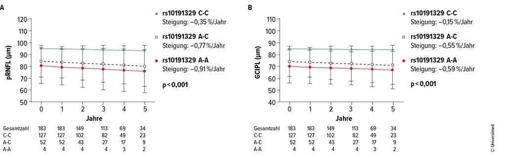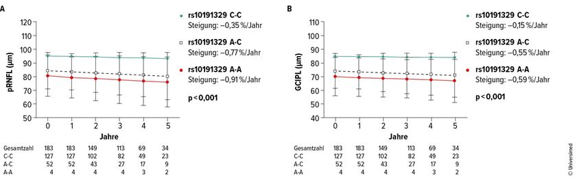 Hinsichtlich rs10191329 waren 4 (2,2%) homozygote Risikoträger:innen, 52 (28,4%) heterozygote Träger:innen und der Rest Nichtträger:innen. Bei Träger:innen zeigten sich bereits zu Baseline geringere pRNFL/GCIPL-Dicken (Abb. 2). Zudem tendierten sie zu höheren Raten von Behinderungsprogression (Komposit und Einzelkomponenten), ohne dass diese Unterschiede die Signifikanzschwelle überschritten.