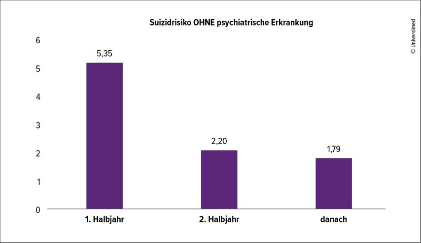 Abb. 1: Nach der Erstdiagnose einer Epilepsie weisen Betroffene ohne psychiatrische Komorbidität ein deutlich erhöhtes Suizidrisiko auf (mod. nach Christensen et al. 2007)5