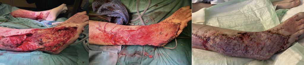 Abb. 2: Patient 2: Deckung einer Stromaustrittsläsion an der rechten unteren Extremität mittels freier Latissimus-dorsi-Lappenplastik, anastomosiert an die A. tibialis anterior, ergänzt durch Spalthauttransplantation