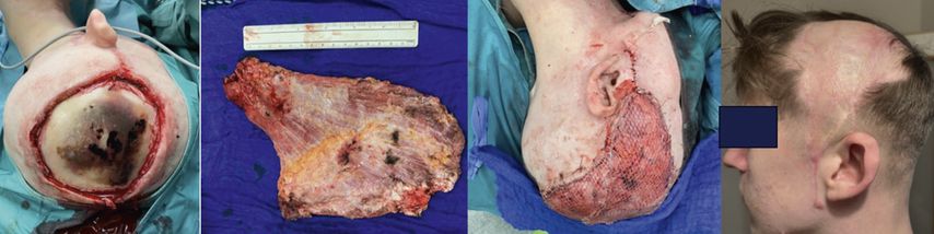 Abb. 3: Patient 3: Ausgedehnte Nekrose der Kopfhaut und Schädelkalotte. Rekonstruktion der Kalotte mittels Palacos® durch die Neurochirurgie; Weichteildeckung mittels freier Latissimus-dorsi-Lappenplastik, anastomosiert an die A. temporalis superficialis, sowie zusätzliche Spalthauttransplantation